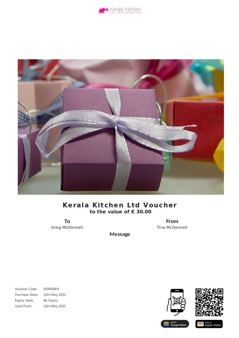 Kerala Kitchen (Drumcondra) Ltd allows you to purchase instantly printable gift vouchers, special offers and tickets using the Voucher Connect platform.